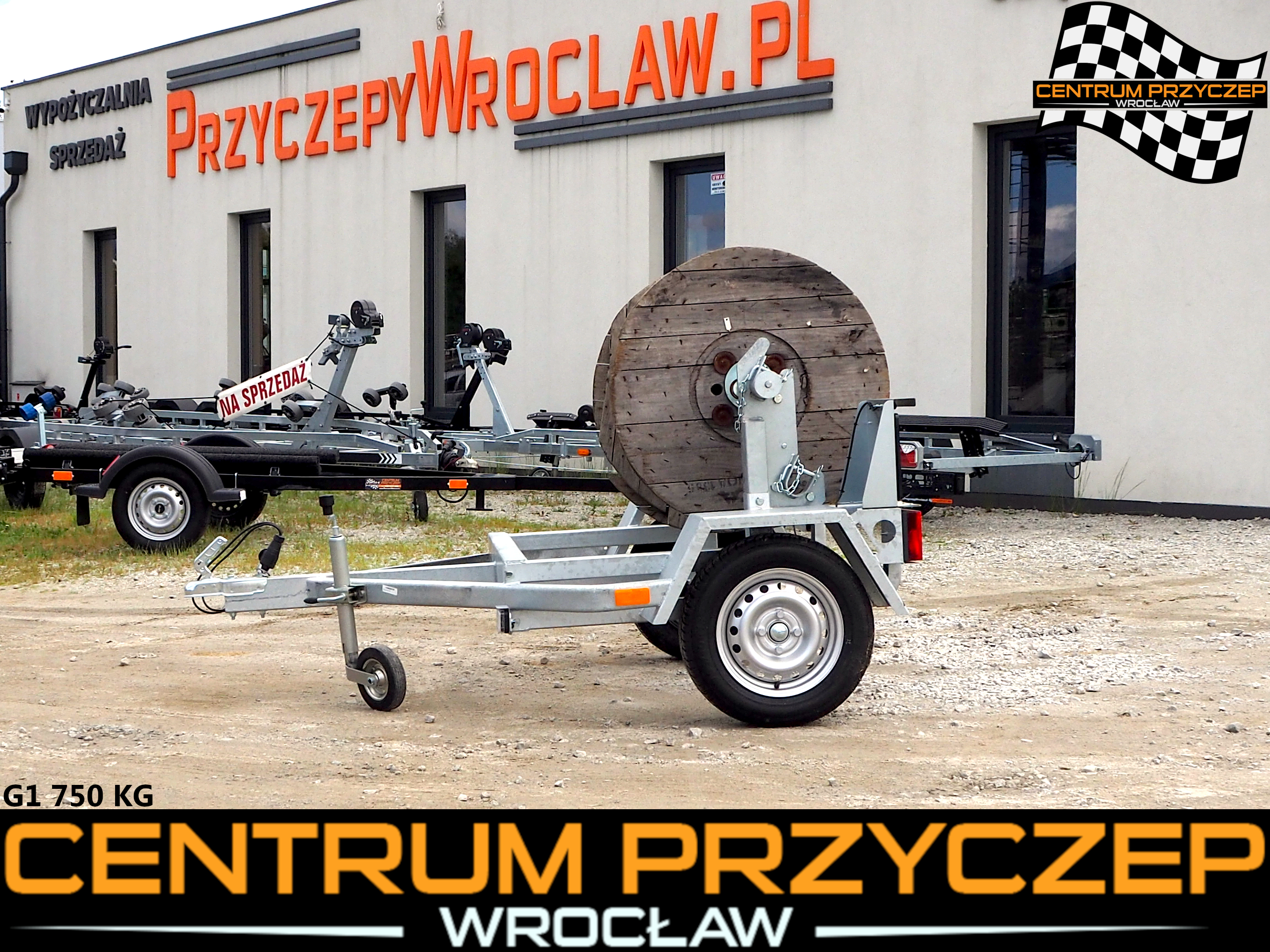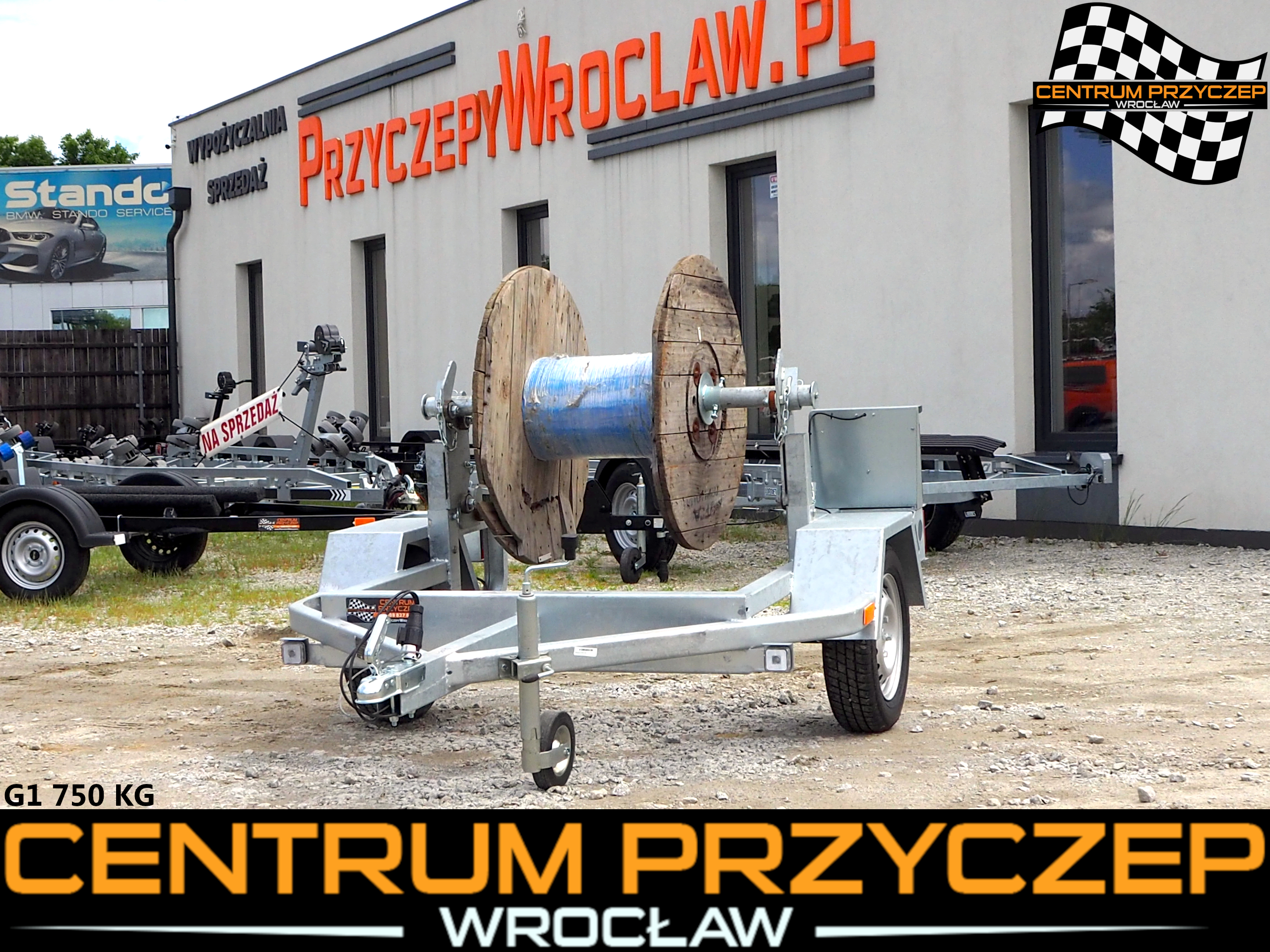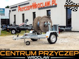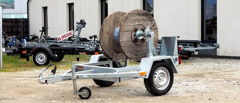 Oferujemy na sprzedaż FABRYCZNIE NOWĄ 1-osiową przyczepę do transportu bębnów kablowych.